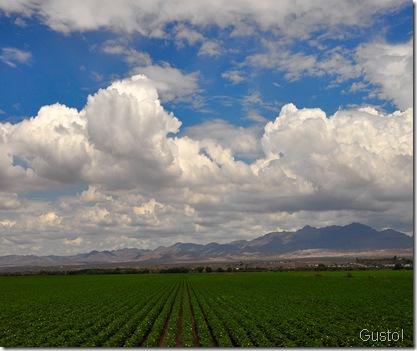Wonderful building storm clouds over the green crop and blue mountains. Beautiful shot.